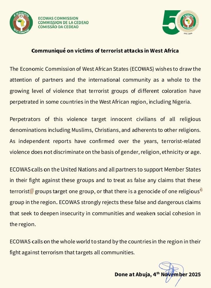 A Communique on the Victims of Terrorists Attacks in West Africa released by the Commission, dated 4th November, 2025, said, “ECOWAS wishes to draw the attention of partners and the International community as a whole to the growing level of violence that terrorist groups of different colouration have perpetrated in some countries in the West African region, including Nigeria.”