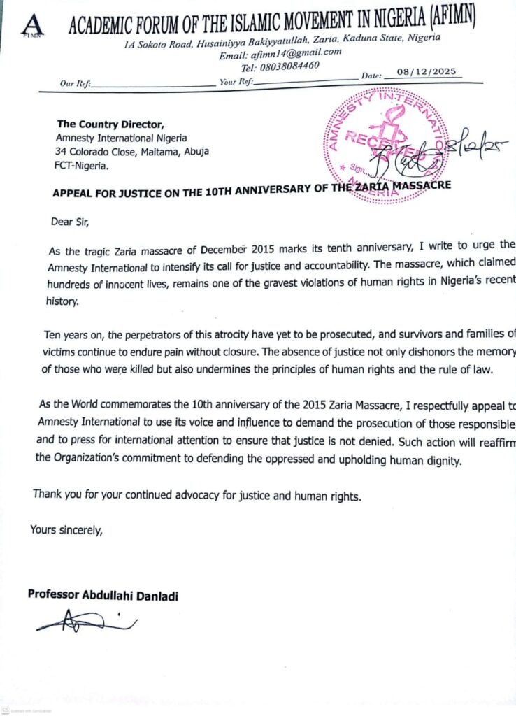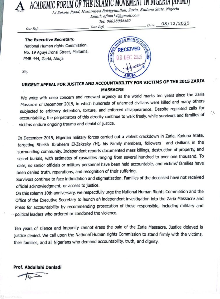 Islamic Movement under the leadership of Sheikh Ibraheem Zakzaky has submitted a petition to international and local bodies calling for renewed pressure to prosecute those responsible for the 2015 Zaria Massacre, as preparation to mark the tragic event’s tenth anniversary is underway.
