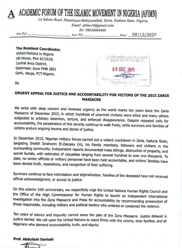 The appeal which was signed on behalf of the movement by Professor Abdullahi Danladi and directed to the United Nations Human Rights Council, Amnesty International, and Nigeria’s National Human Rights Commission, urged the rights organizations to intensify demands for an independent international investigation into the killings.
